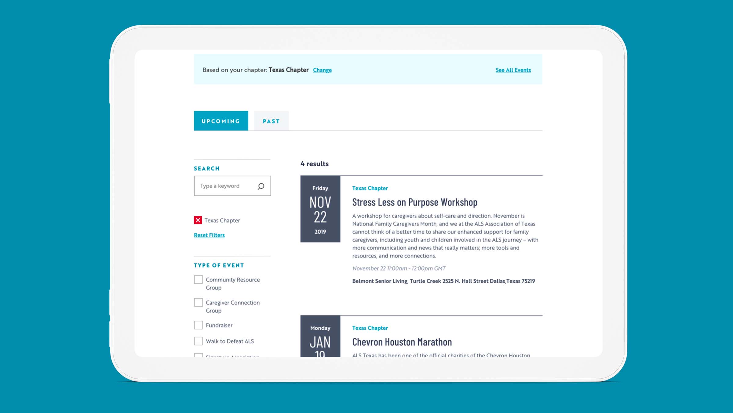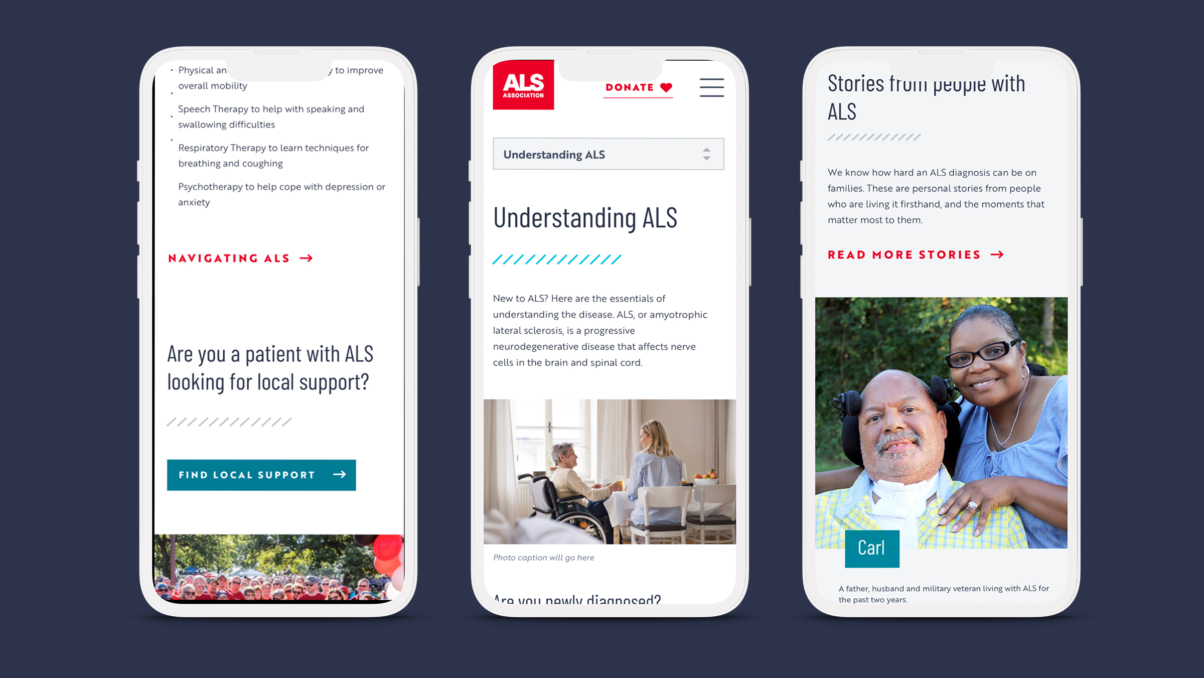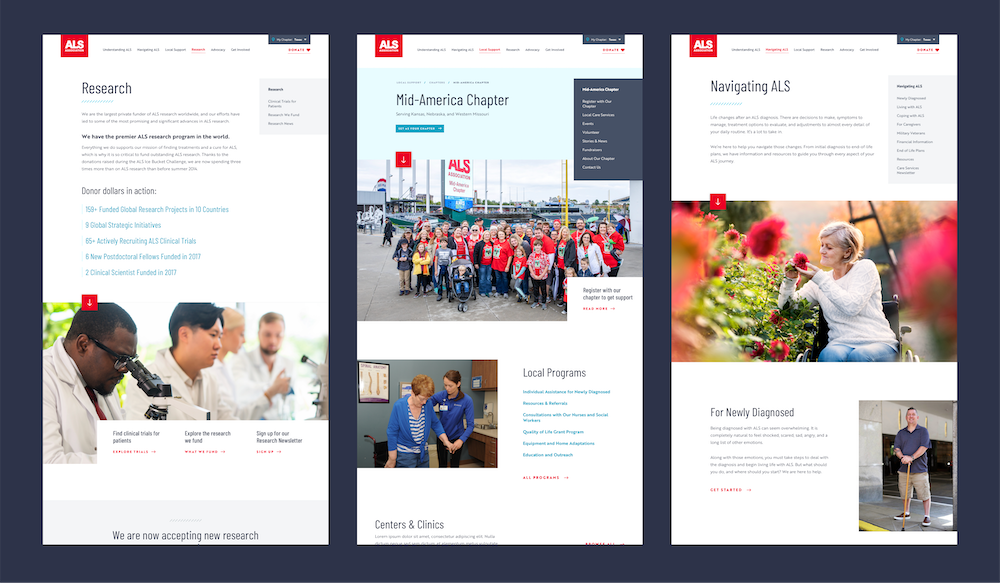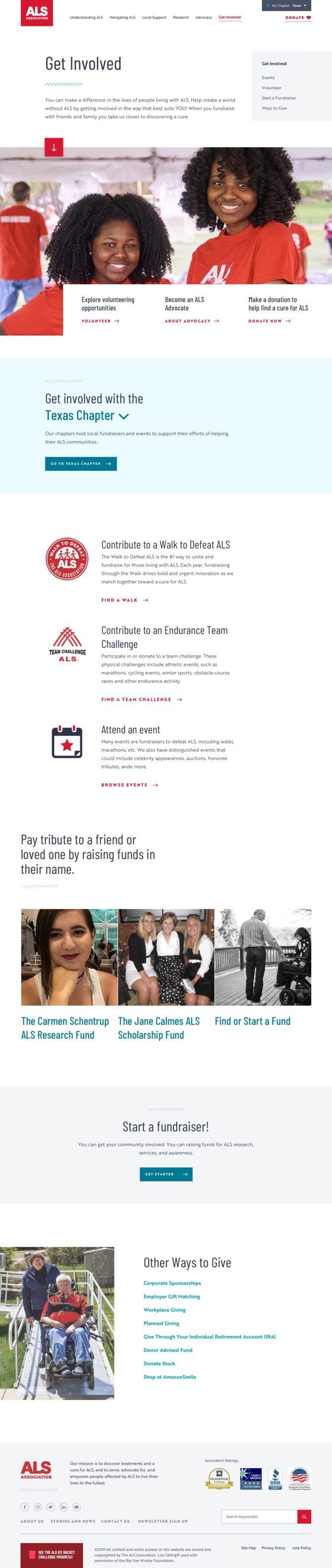 After an in-depth discovery phase—including research, workshops, and interviews with both national and chapter audiences and stakeholders—recommended a strategy to improve the user experience for all audiences, redesign and develop the main ALS website in Drupal 8, and integrate the organization’s digital ecosystem and governance systems to make it easier and more efficient for national and chapter staff and volunteers to manage content and measure their success.