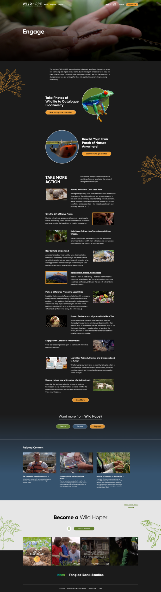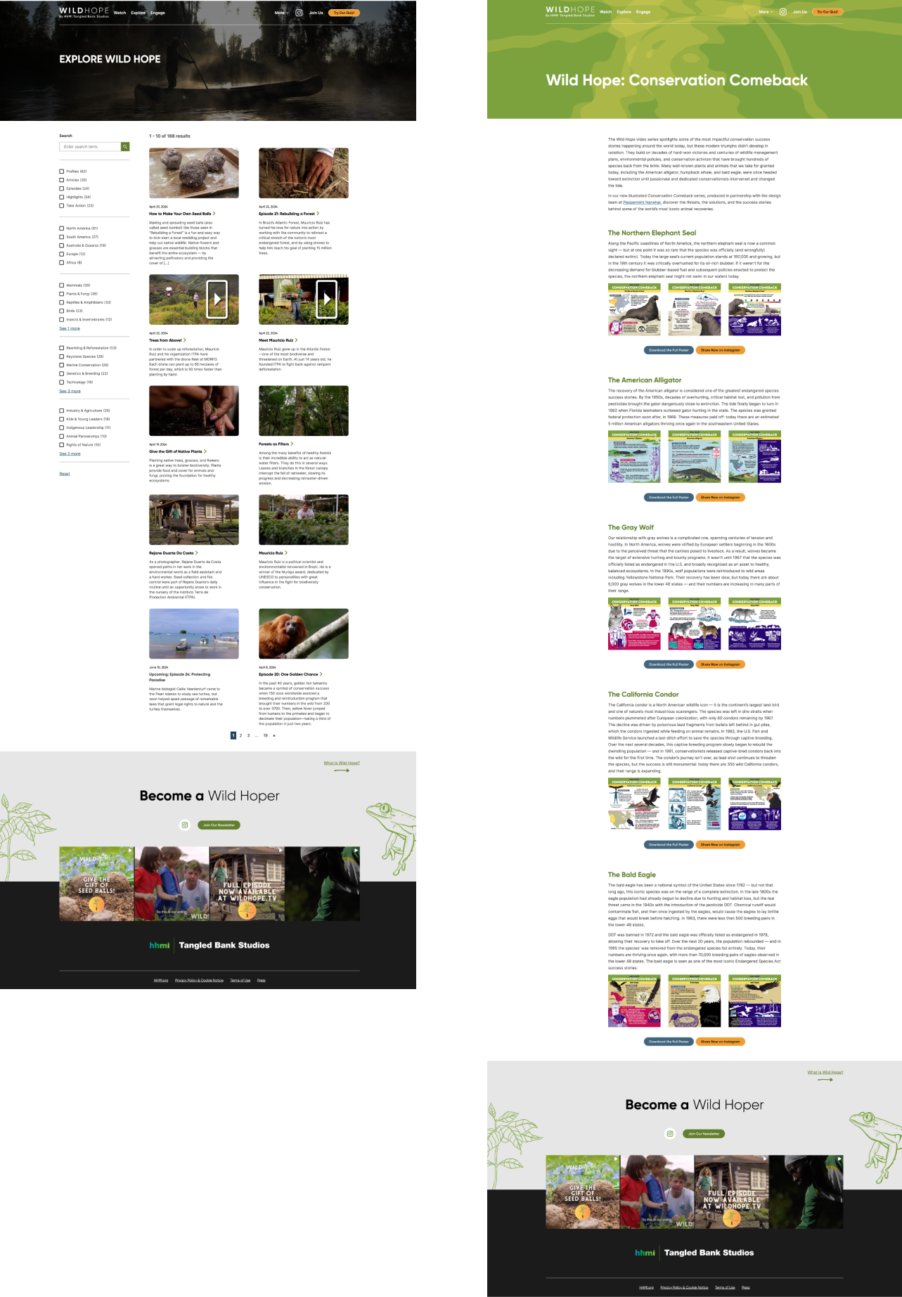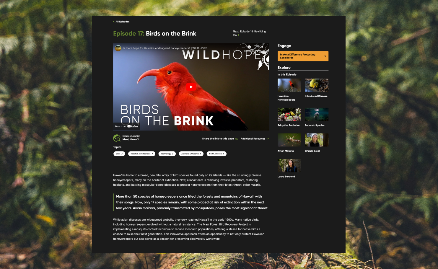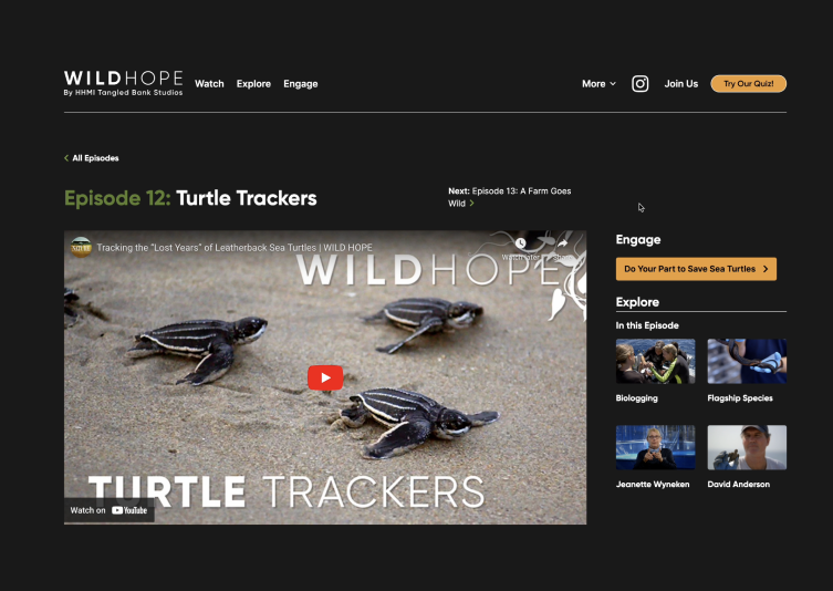 Forum One partnered with HHMI Tangled Bank Studios to build wildhope.tv, the digital hub for the television series. With episodes airing on PBS and YouTube, the online hub provides viewers with additional opportunities to explore the series’ themes and inspire a deeper interest in conservation science.