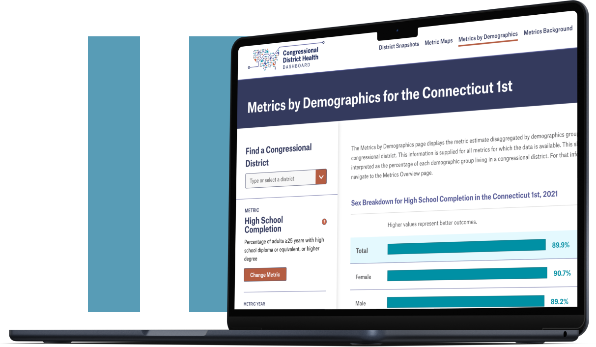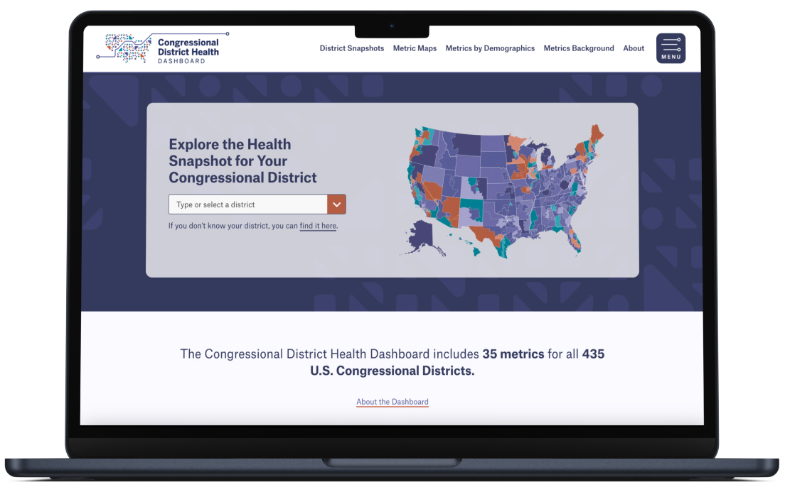 The Dashboard provides policymakers, advocates, and community members with an array of actionable and nonpartisan data at the congressional district level—such as life expectancy, diabetes rates, uninsurance, and children in poverty—to demonstrate strengths and challenges in their regions and drive positive change at the district, state and national level.