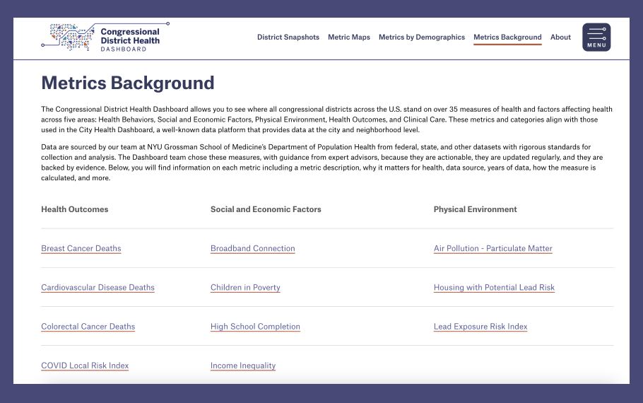 The Dashboard uniquely stratifies critical health data across 435 congressional districts. Building on NYU’s City Health Dashboard, also developed in partnership with Forum One, this Congressional dashboard takes a similar data-driven approach to paint a picture of health corresponding to the geographic areas represented by members of the U.S. House of Representatives.
