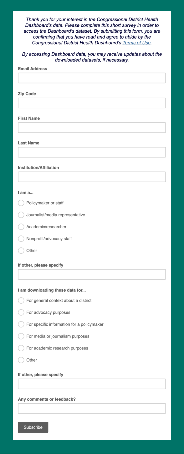 The Dashboard recognizes that while everyone should have the same opportunity to live the healthiest life possible, persistent and systemic barriers to health and opportunity exist in many areas across the country. While city, state, and regional-level data exist, the Congressional District Health Dashboard launched in January 2023 as a first-of-its-kind resource, offering trusted data on health and its drivers for all 435 (and Washington DC) U.S. congressional districts.