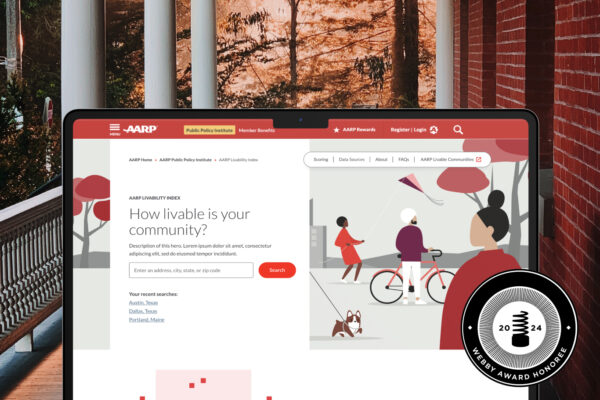 We are also proud to be a part of the Webby Honored project with AARP’s Livability Index. AARP Livable Communities works to help communities be great places to live for people of all ages. Since 2018, Forum One has collaborated with AARP Livable Communities to enhance their websites and digital products, offering services in digital and data strategy, user experience, visual design, data visualization, mapping, and technical development. To improve the Livability Index, Forum One updated the index data and introduced new features to broaden the user experience and tool usability. This included a Community Finder tool with a quiz and a results page featuring over 50+ filterable metrics, along with a refreshed design for the Index’s gauges, color scheme, and top communities display.