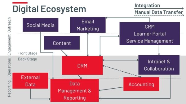 A digital ecosystem map is a visual diagram of all the online tools and platforms used within an organization. It illustrates processes, how data moves between components, and whether it is automated or manual. And just as importantly, it also shows where systems are not currently connected or able to speak or transfer data to one another. A good digital ecosystem map can also illustrate the users of each system and who is responsible for maintaining them.