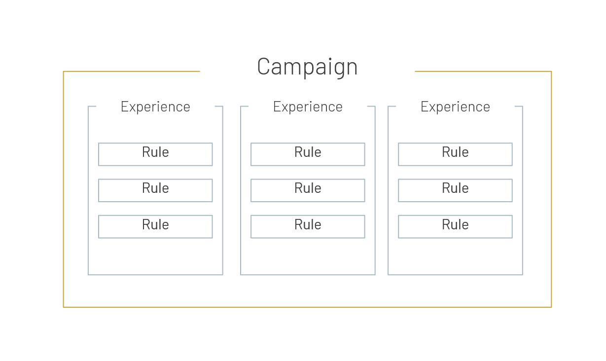 First and foremost, we want to make the tool easy for content creators to tailor personalized experiences. We did this by organizing each personalized content into campaigns, which are grouped experiences. Experiences are central to administering personalized content, with rules that contain business logic for displaying such content.
