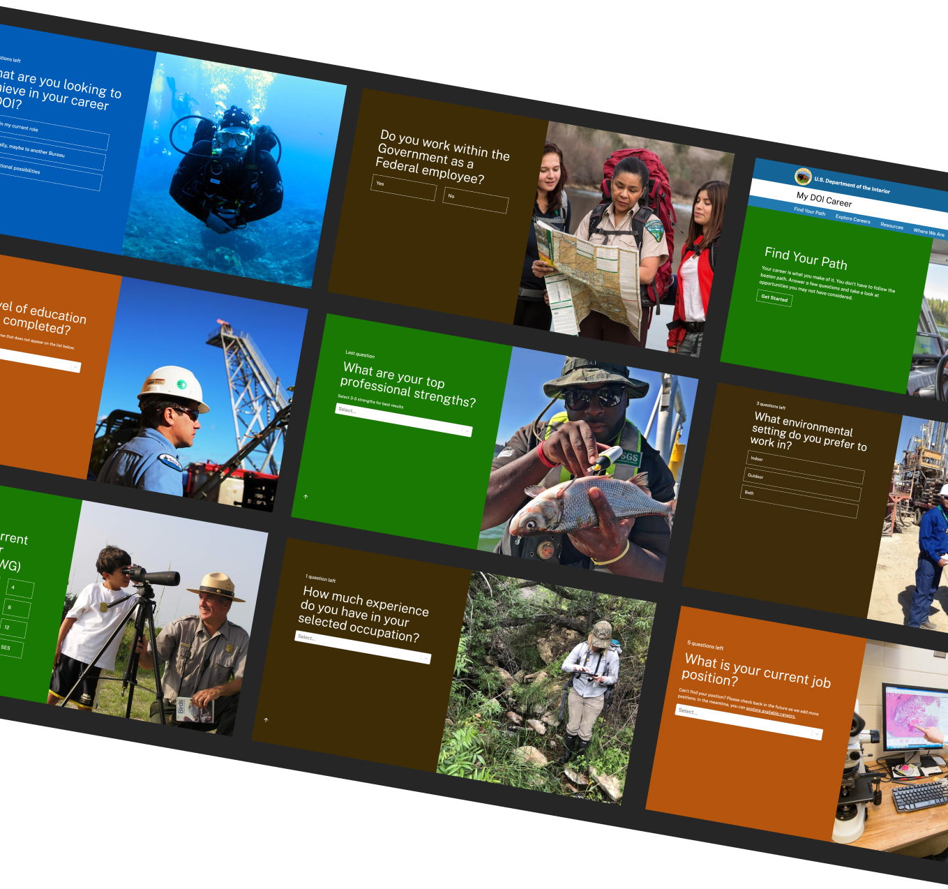 As a government agency with more than 70,000 employees, the U.S. Department of the Interior (DOI), stewards public lands, increases environmental protections, pursues environmental justice, and honors nation-to-nation relationships with Tribes. Forum One developed an engaging quiz using AI that matches job seekers to opportunities based on their status of federal employment, level of education, job experience, and professional strengths.