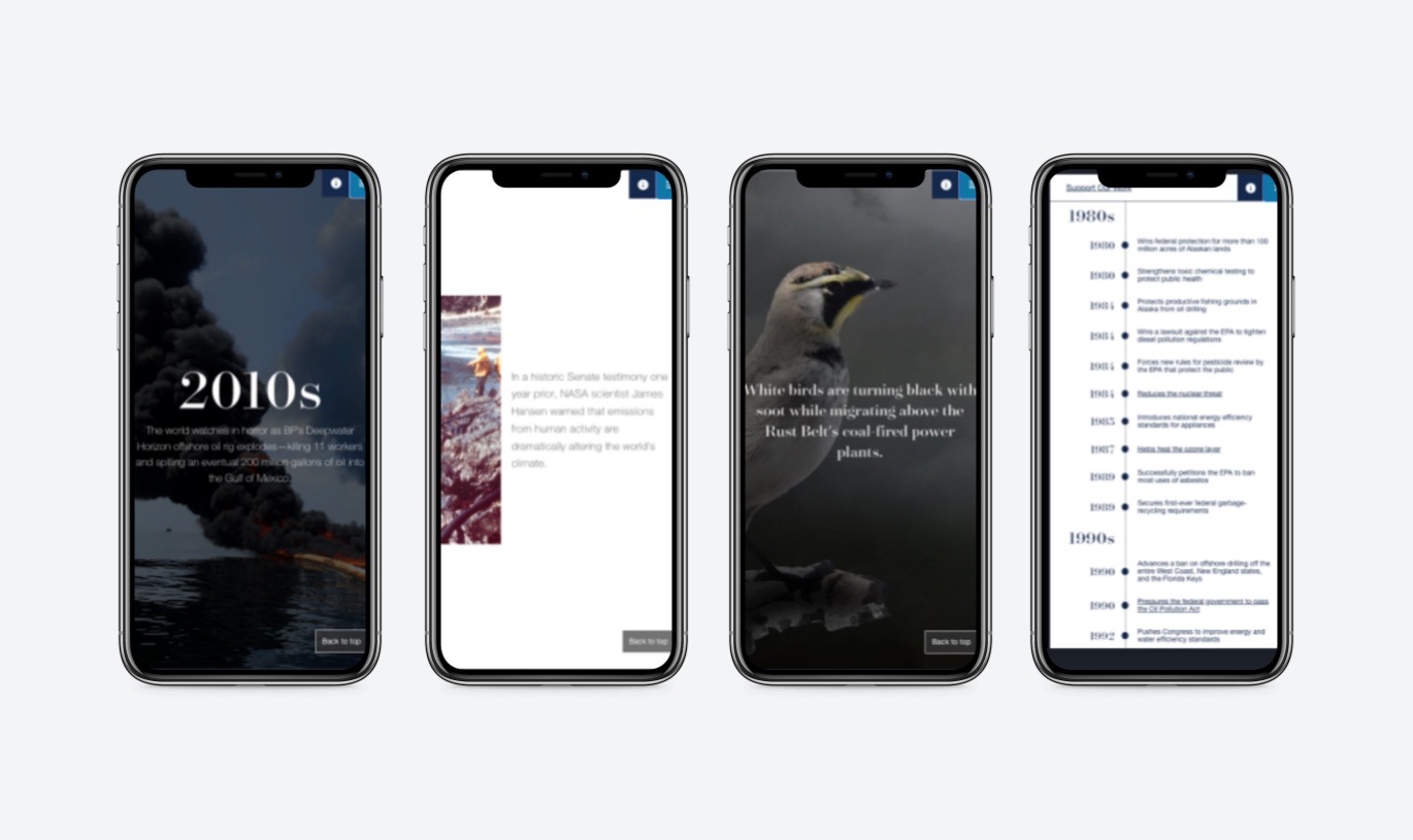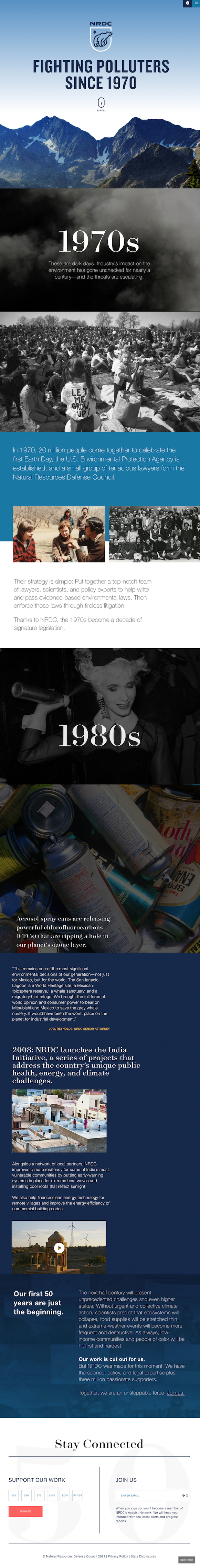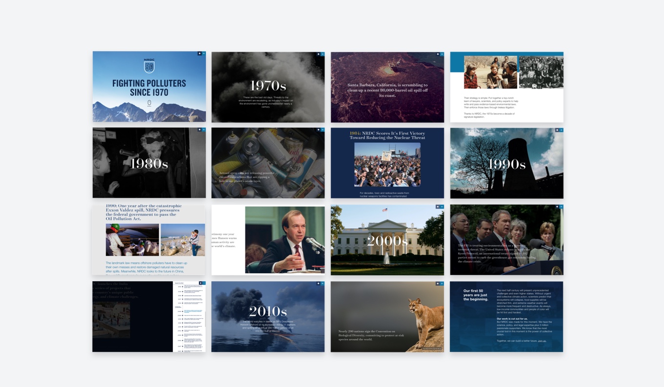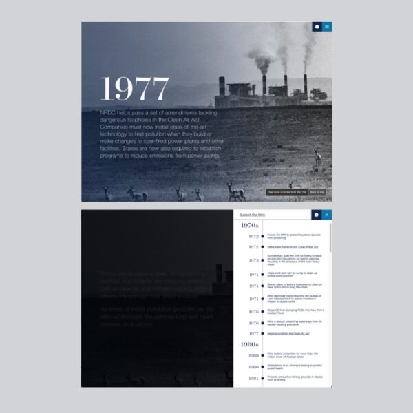 For NRDC’s 50th anniversary in 2020, we designed and developed an immersive, longform digital storytelling experience illustrating NRDC’s 50 years of environmental impact by taking audiences on a visually compelling, interactive journey through a series of key events.