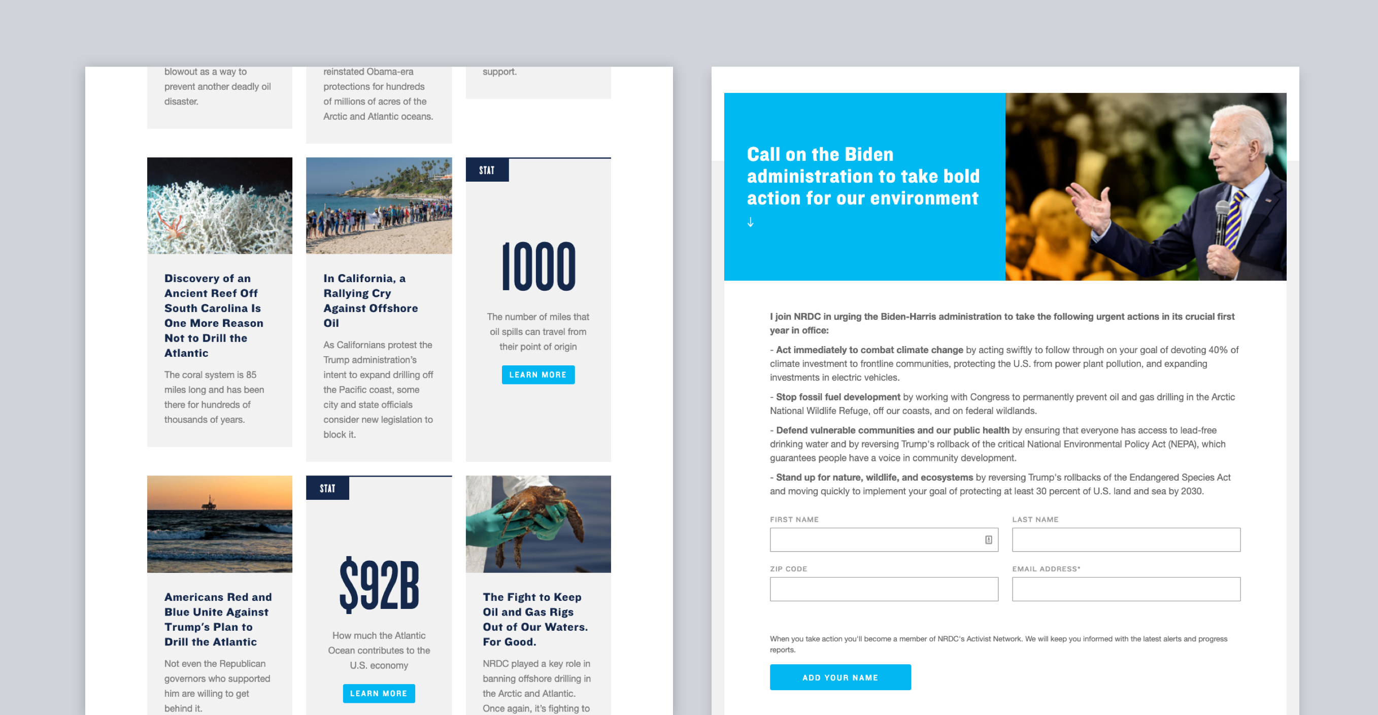 Forum One worked with NRDC to create the Offshore Drilling Position Tracking Tool to help people easily find their elected representatives’ positions on offshore drilling and instantly take action to contact them and advocate for the environment. The tool’s emphasis on ease of use, clear calls-to-action, and effective messaging gives NRDC an active and engaging platform to drive tangible action and quickly respond to current legislation and issues.