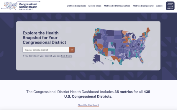 The Dashboard recognizes that while everyone should have the same opportunity to live the healthiest life possible, persistent and systemic barriers to health and opportunity exist in many areas across the country. While city, state, and regional-level data exist, the Congressional District Health Dashboard launched in January 2023 as a first-of-its-kind resource, offering trusted data on health and its drivers for all 435 (and Washington DC) U.S. congressional districts.