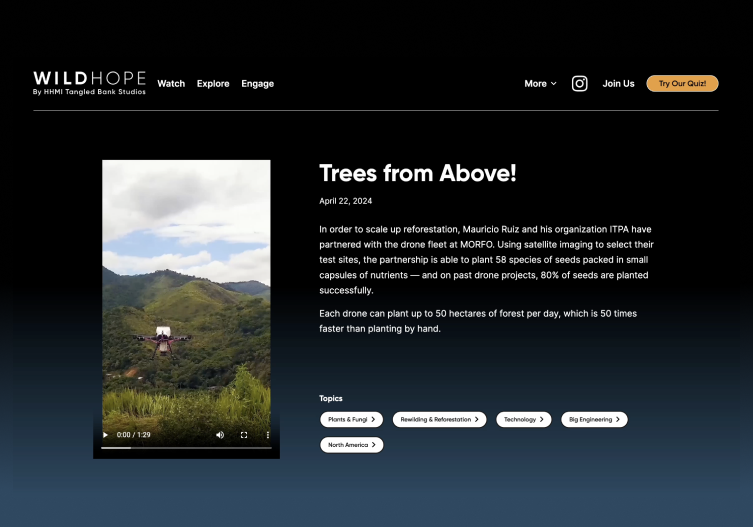 Forum One partnered with HHMI Tangled Bank Studios to build wildhope.tv, the digital hub for the television series. With episodes airing on PBS and YouTube, the online hub provides viewers with additional opportunities to explore the series’ themes and inspire a deeper interest in conservation science.